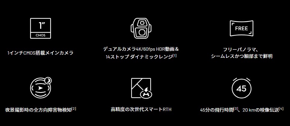 1インチCMOSの広角カメラを搭載し、4K/60fps HDRと4K/120fpsの動画撮影、10-bit D-Log Mカラーモードに対応しています。夕暮れやナイトシーンなどの低照度条件下でも細部にわたりディテールを維持し、息をのむような映像を撮影することができます。