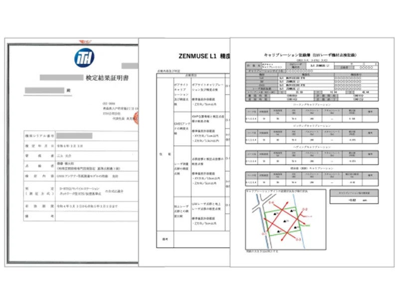 機器の性能が、カタログスペックに合致していることが確認された際には、【無人航空機検査証明書】を発行します。機材をお預かりし、精度点検を実施した上で、以下の書類が発行されます。