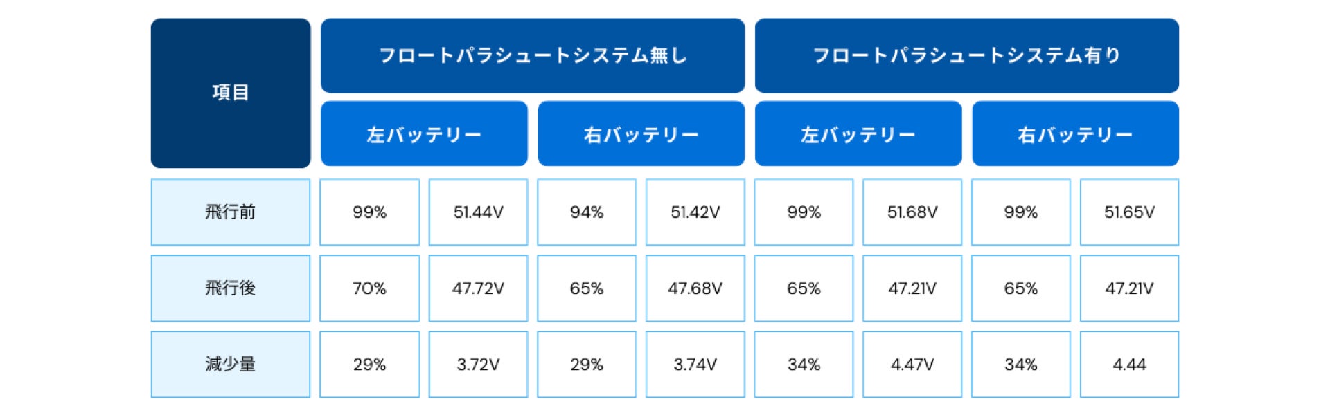 下の表は高度40mでミッション飛行(11分39秒の飛行)をシステム搭載「無し」と「有り」の状態で実施した際のバッテリー残量の減少量を計算した表です。10分以上の飛行を行っているにもかかわらず、搭載の有無でバッテリー減少量の差が5%のみだったため、飛行時間への大きな影響はなしとしています。