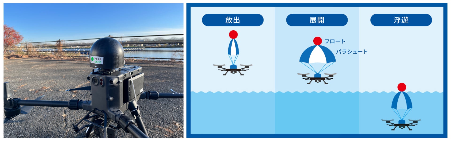 水上を飛行するドローンに対応した安全装置です。水に浮く機能(フロート)と、落下衝撃を緩和する機能(パラシュート)を一体化したシステムで、このシステムを搭載することで、水上飛行での緊急事態に備えることができます。水上に墜落してもパラシュートで衝撃緩和し、フロートで浮揚するため、機体の回収が行えます。