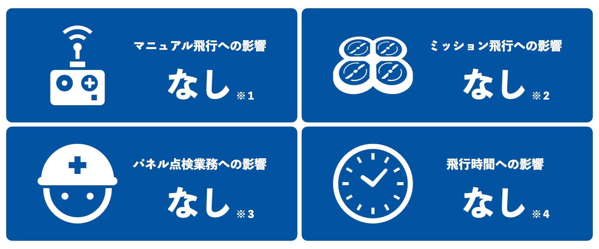 本検証で太陽光パネル点検を担当したALSOKにヒアリングを行なったところ、フロートパラシュートシステムが搭載されていても撮影画像等への影響はないことから、パネル点検業務への支障は無かったと回答あり。