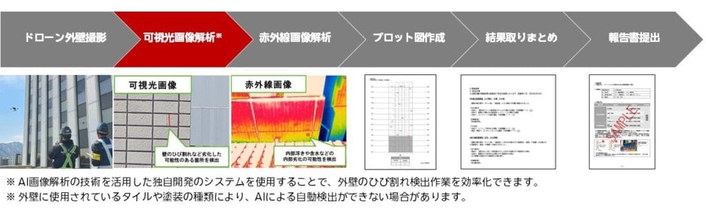 画像解析作業では、ドローンで撮影した可視光画像と赤外線画像の両方(注3)を使用している。本システムは可視光画像をAIで解析し、ひび割れの疑いがある箇所を自動検出したうえで、専門スタッフが目視確認を行うことで信頼性を高めている。赤外線画像については、温度差などから内部劣化の可能性を解析し、その結果を踏まえて劣化箇所を整理したプロット図と報告書を作成する。開発時に実施した沖縄県那覇市の大型商業施設「パレットくもじ」での検証では、可視光画像の解析作業時間を約48%削減できることが確認されている(注5)。今後は、外壁調査を行う事業者向けに、画像解析から報告書作成までを一括提供するサービスの展開も予定している。