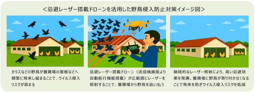 2025年10月中旬より、NTT e-Drone Technology(NTTイードローン)とNTT東日本千葉事業部は、千葉県と協力して高病原性鳥インフルエンザの予防対策に取り組む。県内の養鶏場を対象に、忌避レーザーを搭載したドローンを活用し、野鳥の侵入を防ぐ新たな防疫ソリューションを導入する。