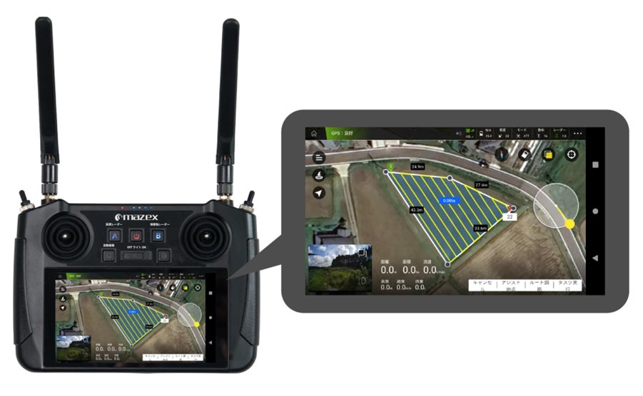 Android OSを搭載し、アプリ上で散布エリアを指定することで自動飛行を実現。障害物回避も可能。