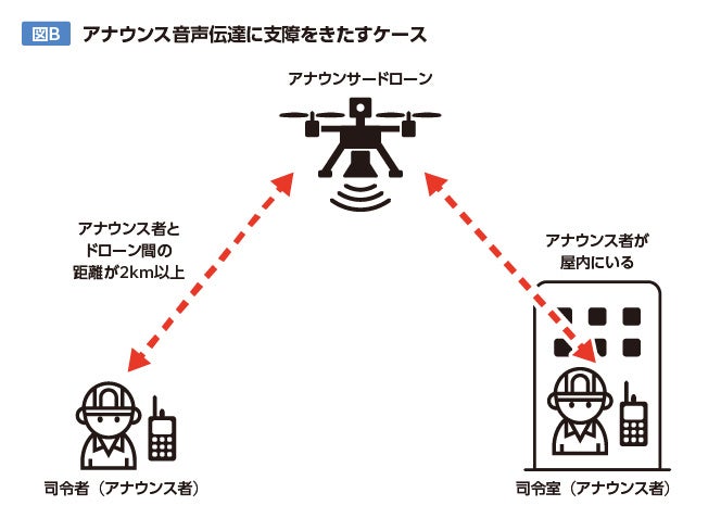 昨今、防災・災害対応以外の用途での「アナウンサードローン」の活用検討案件が増える中「ドローンの飛行場所から離れた屋内で、映像監視とアナウンスを行いたい」という要望があり「アナウンサードローン」への音声伝達にはデジタル簡易無線を使用しているため、アナウンス者とアナウンサードローン間の距離の制限(音声伝送の電波到達距離は見通し2km程度)や、屋内からドローンに電波が到達しない場合がある、という課題がありました(図B)。