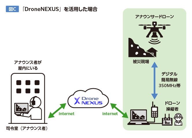 クオリティソフトが開発、提供するドローンの運用管理クラウドサービス「DroneNEXUS」は、ドローンの運用に最適化されたPC間コミュニケーション機能を有しており、デジタル簡易無線と組み合わせる事により(図B)の課題を解決し「ドローンの飛行場所から離れた屋内で、映像監視とアナウンスを行う」運用を可能としました(図C)。