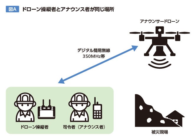 これまで「アナウンサードローン」は防災・災害対応で検討されるケースが多く、ドローンの飛行状況を目視できる場所に「ドローン操縦者」と「アナウンス者」の両者がいる事を前提とした提案を行っていました(図A)。