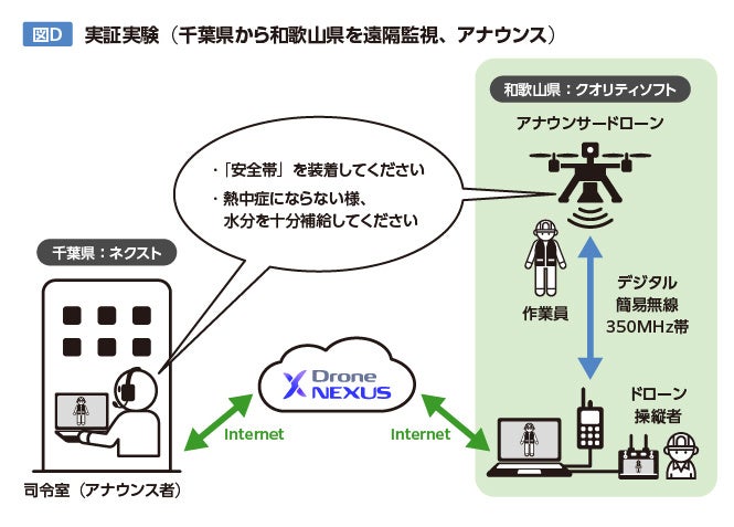 ネクストのオフィス(千葉県)から、クオリティソフト本社(和歌山県)の前庭に立つ作業員の様子をドローンのカメラにより確認し、アナウンスを行い、アナウンスを聞いた作業員は、その指示に従い行動するという実証実験が行われました(図D)。