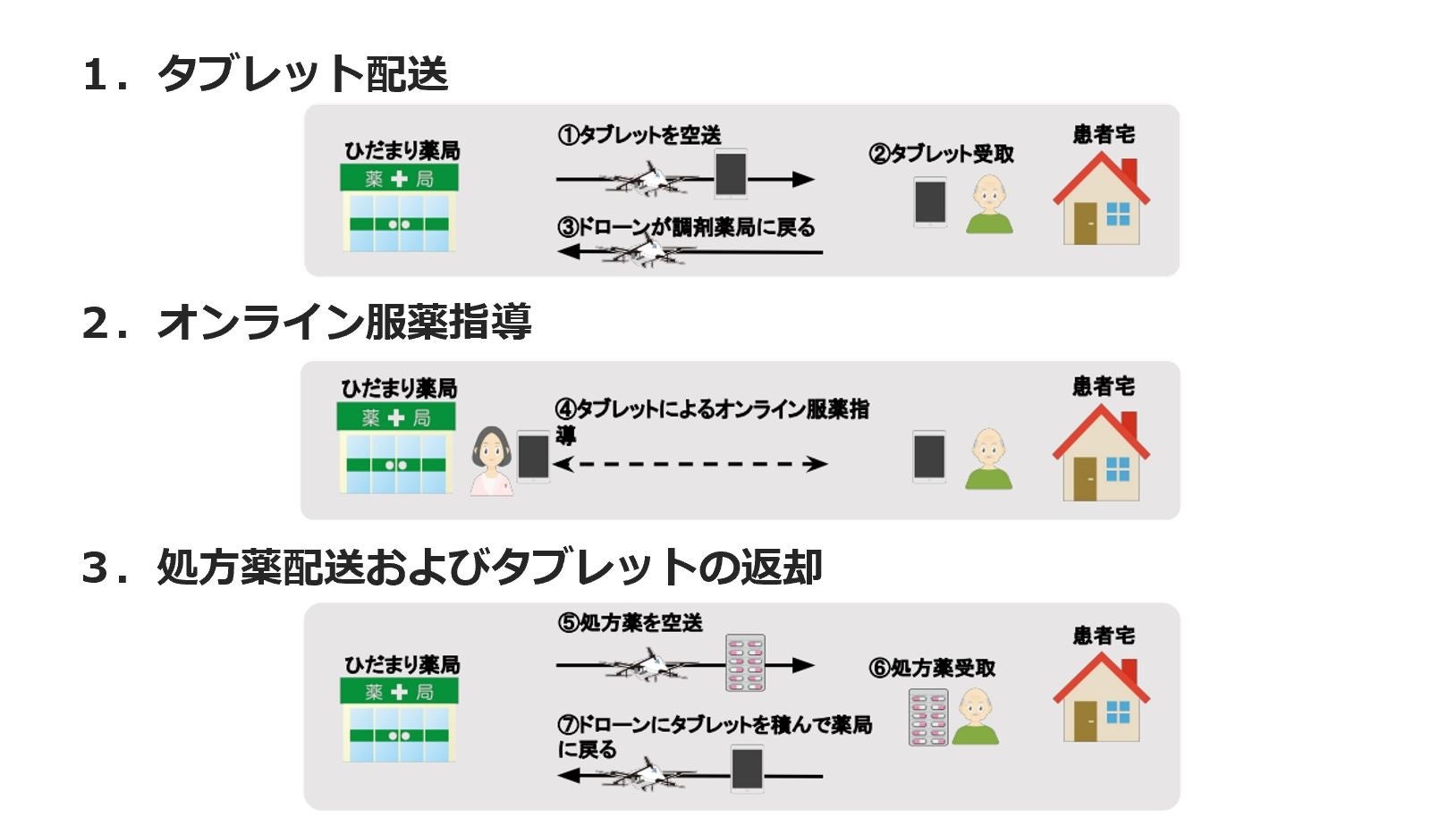 ・オンライン服薬指導と組み合わせ、ドローンによる処方薬配送オペレーションを確認できた。