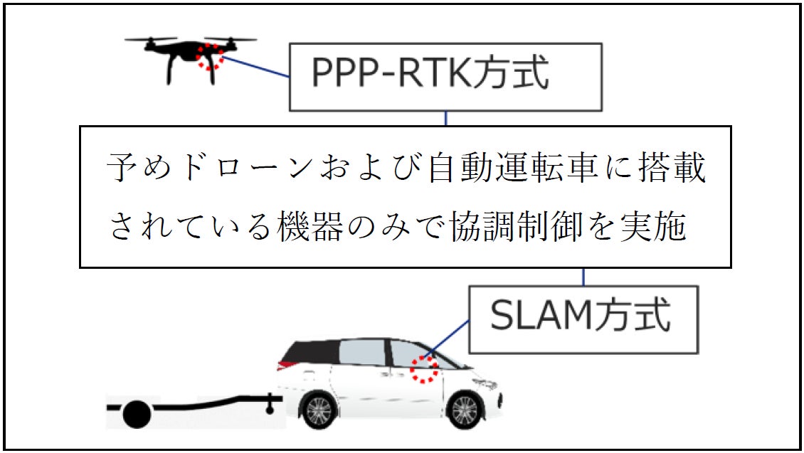 本実証では、以下の異なる測位方式を、2社が開発した「協調制御プラットフォーム(注1)」(以下 本プラットフォーム)を活用することで連携可能にし、自動運転車とドローンがお互いの位置情報を把握して協調動作できることを確認しました。