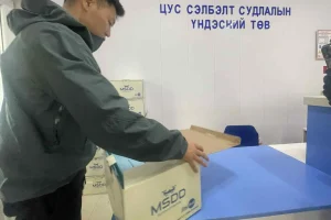 血液製剤を物流ドローン専用箱に詰めるスタッフ(ウランバートル市 国立輸血センター)